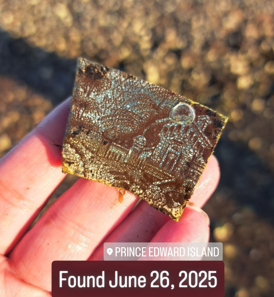 This piece is built around a remarkable sea pottery shard, unearthed just weeks ago, depicting the faded remnants of a grand estate, perhaps once a palace, now softened by time and tide. Its deep, intricate crazing gives the scene a dreamlike texture, as if nature is slowly reclaiming what once was. Surrounding this focal treasure are complementary shards in earthy terracotta and weathered teal, including a delicately worn flower pot, another recent and cherished find. Rich forest green sea glass, along with scattered carnelian and garnet-like gems, grow between the fragments like overgrown roots and blossoms in a long-abandoned garden. Together, these relics evoke a place once full of grandeur, now peacefully surrendered to nature’s quiet embrace.