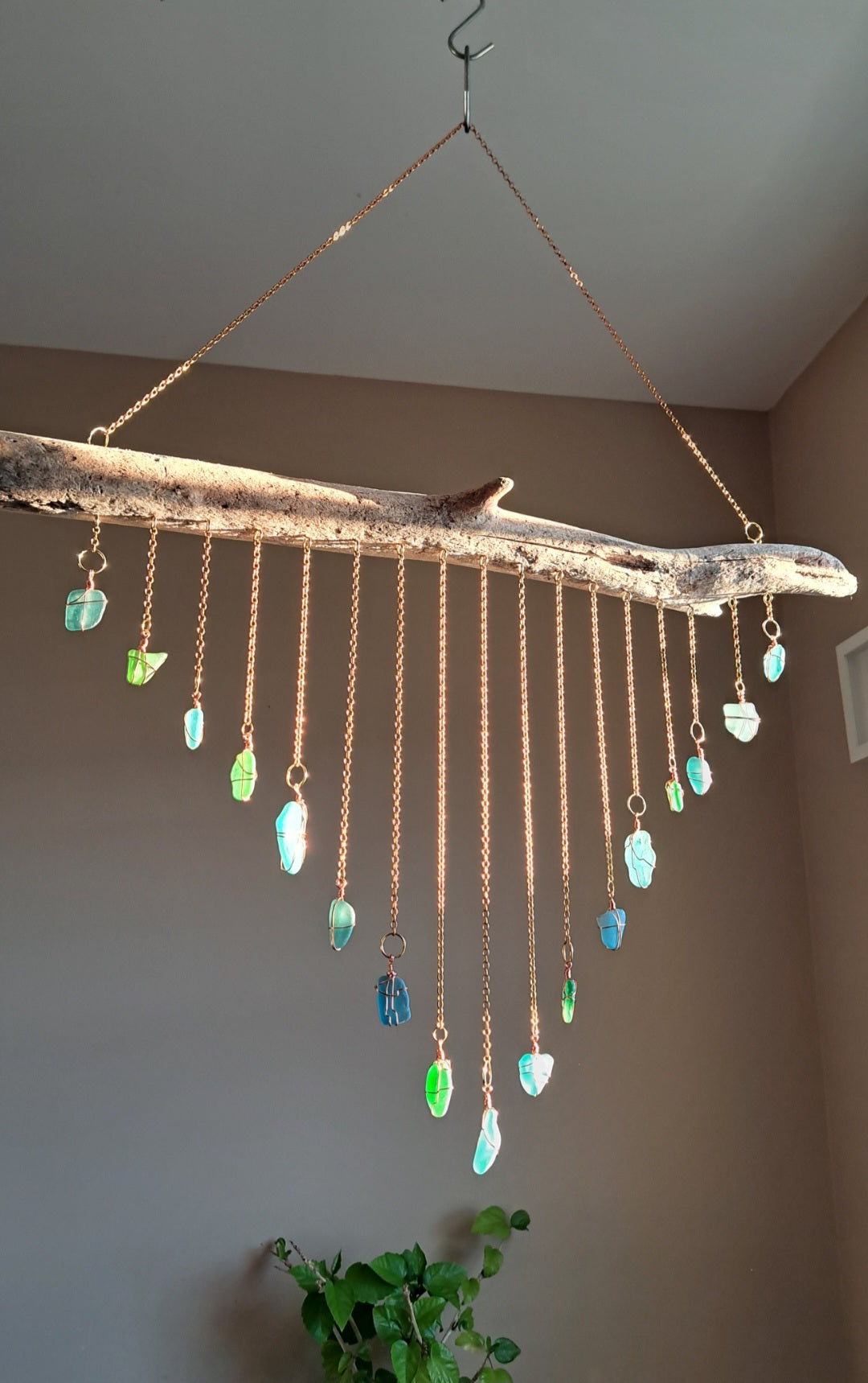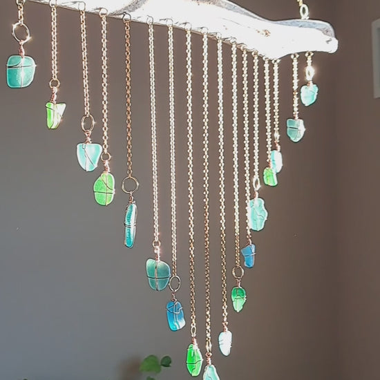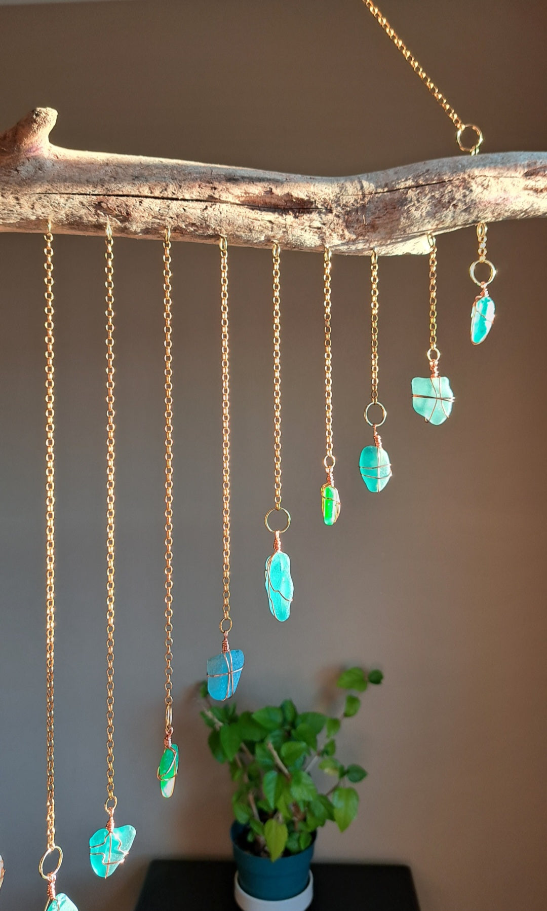 I created this one-of-a-kind suncatcher using a beautiful piece of driftwood and large chunks of genuine sea glass in rich shades of Caribbean blue, teal, and emerald. Each piece of sea glass is hand-wrapped by me in rose gold-colored wire and suspended from warm copper chain links, forming a striking V-shaped cascade.