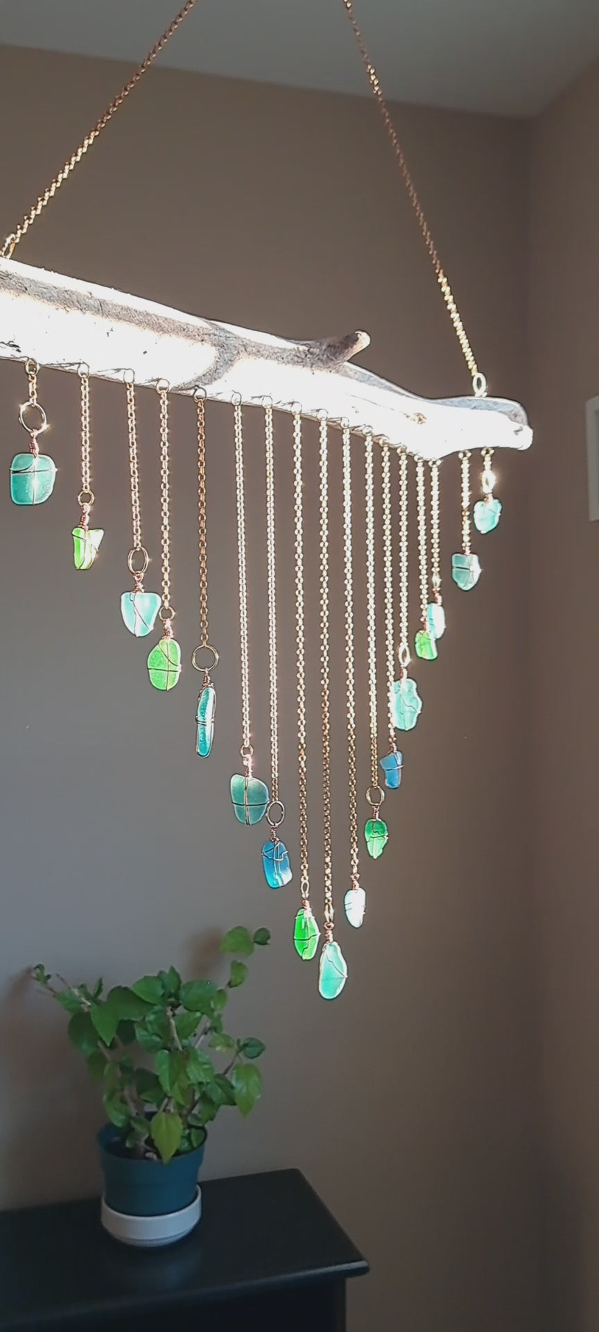 The finished piece measures 68 cm wide and 42 cm long from the driftwood to the tip of the glass, with an additional 31 cm of hanging chain so 73cm in length. When the sunlight shines through, the copper glows and the sea glass comes alive with depth and brilliance, shifting from bright ocean blues to deep emerald greens.