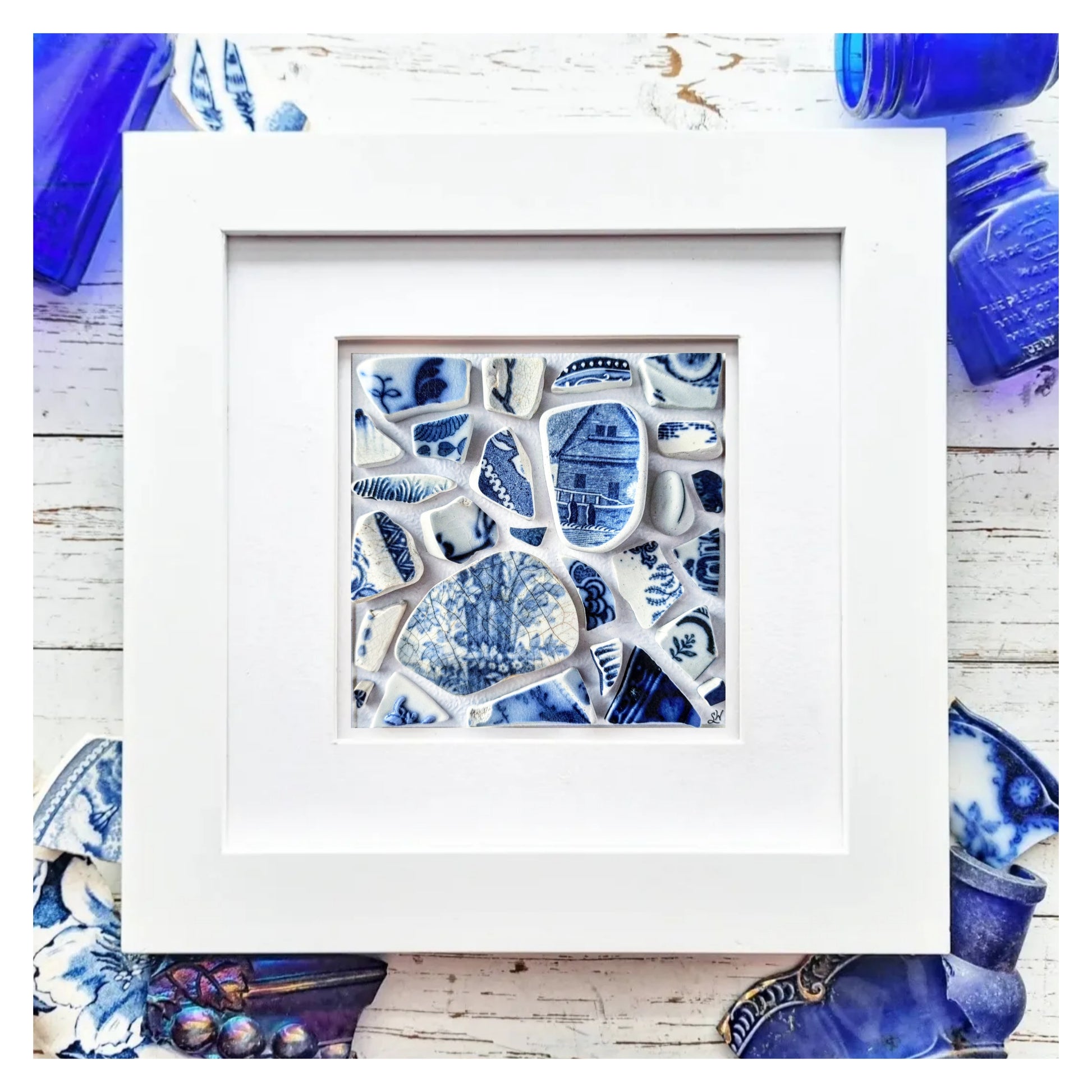 A timeless mosaic of sea-worn porcelain, carefully gathered from tides past. At its heart rests a rare house fragment and a large floral shard, each steeped in history and softened by the sea. Surrounding shards carry delicate antique patterns and brushstrokes, coming together to create a serene composition of blue and white elegance.