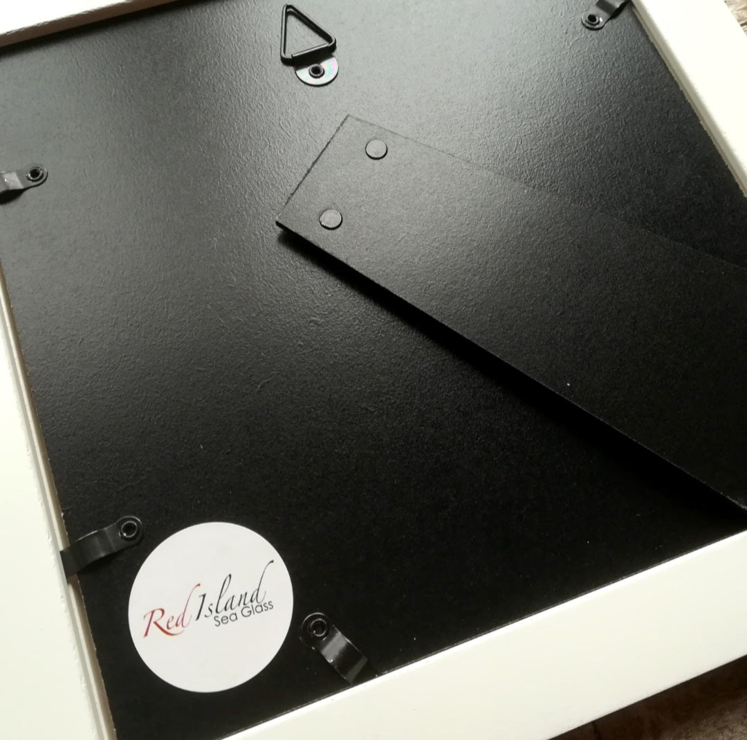 Dimensions: 10" x 10" Inch square white frame with a glass cover- inner sea glass section is 5"x5". Can be displayed on a table or hung on a wall.