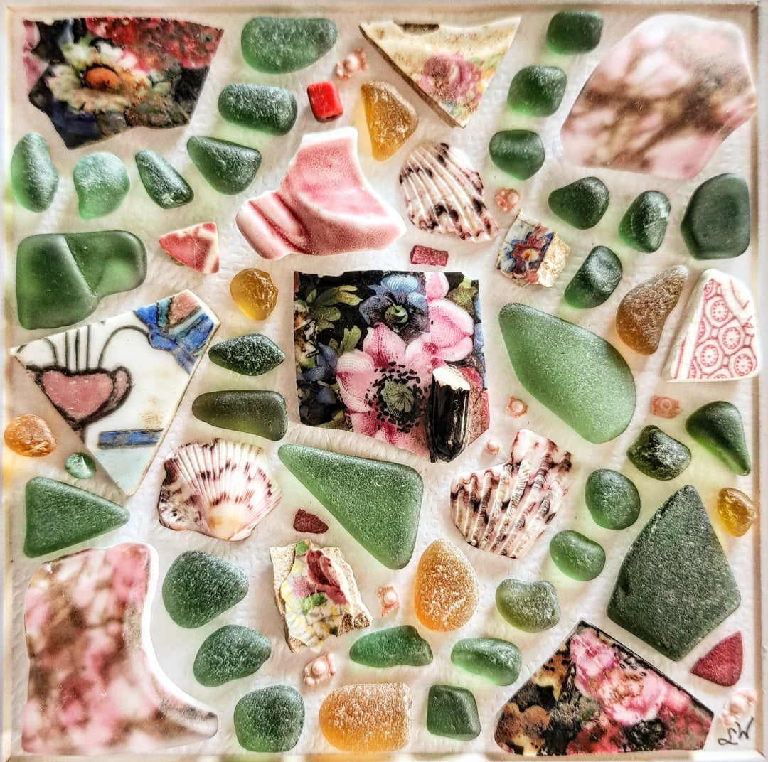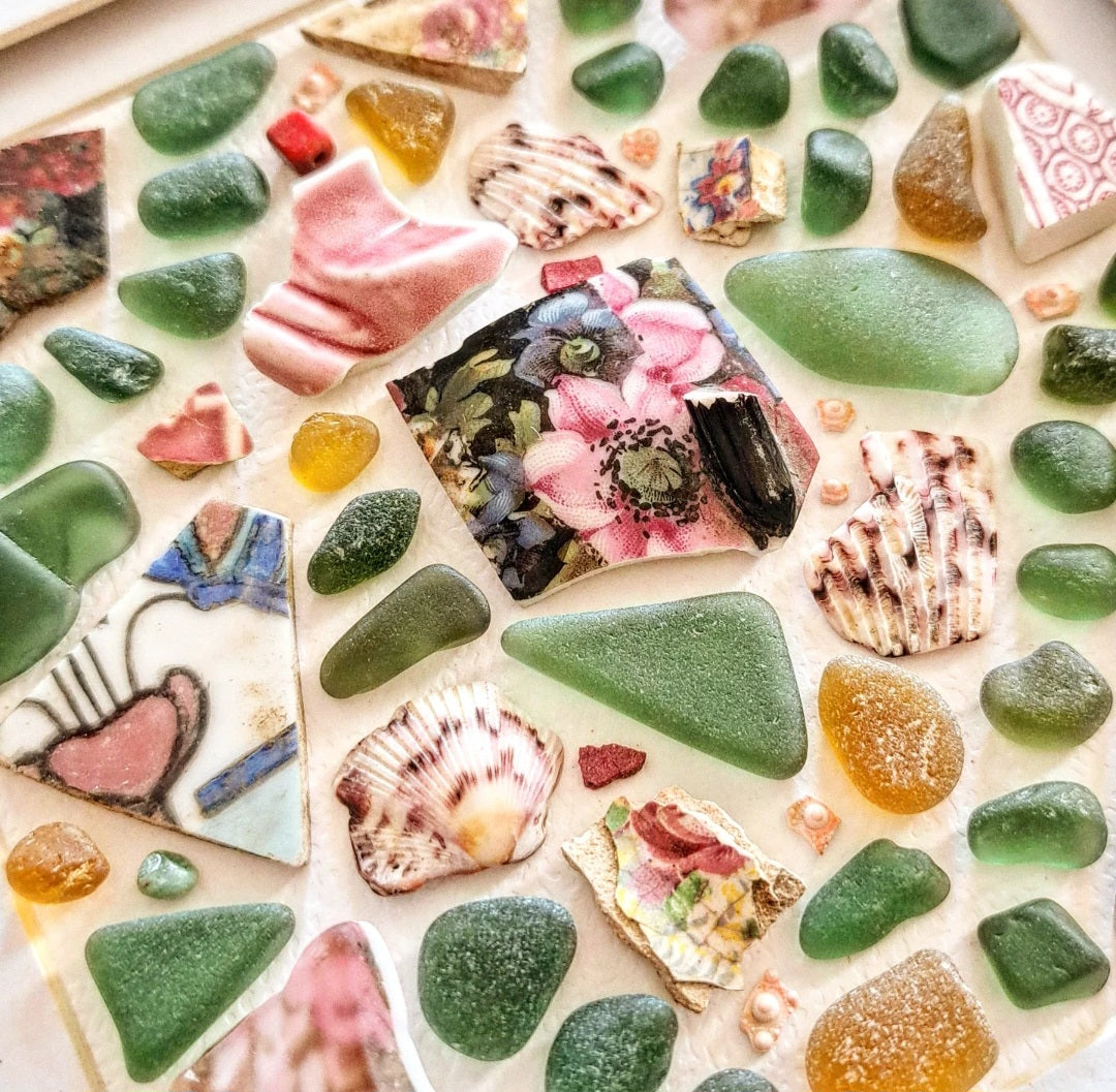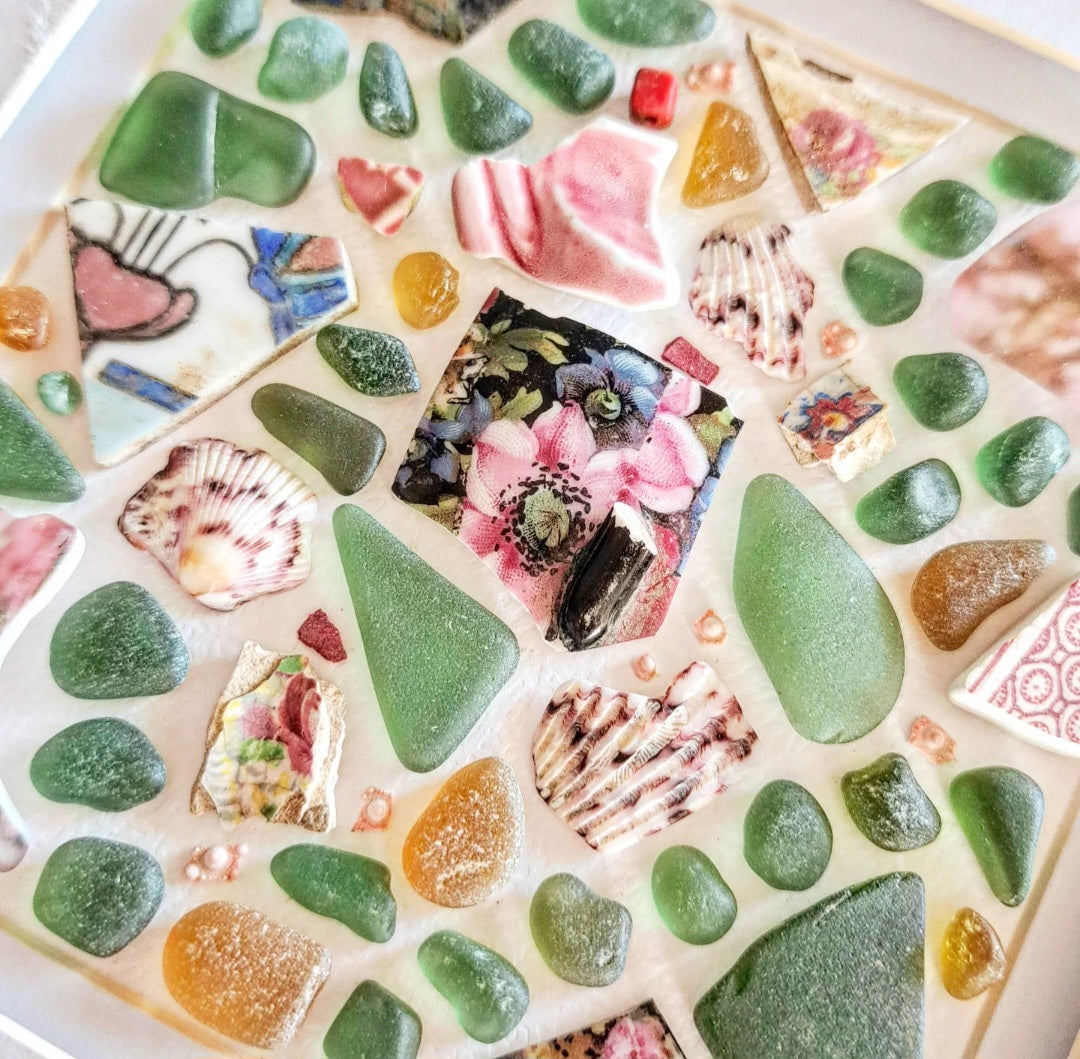 It's summertime here on Prince Edward Island, so my newest sea treasure frames include both fresh beach finds and special pieces from my long-time collection. I’ve been beachcombing for over 20 years, and sometimes I even find matching shards years apart. I also love going through my mom’s collection, which dates back even further.