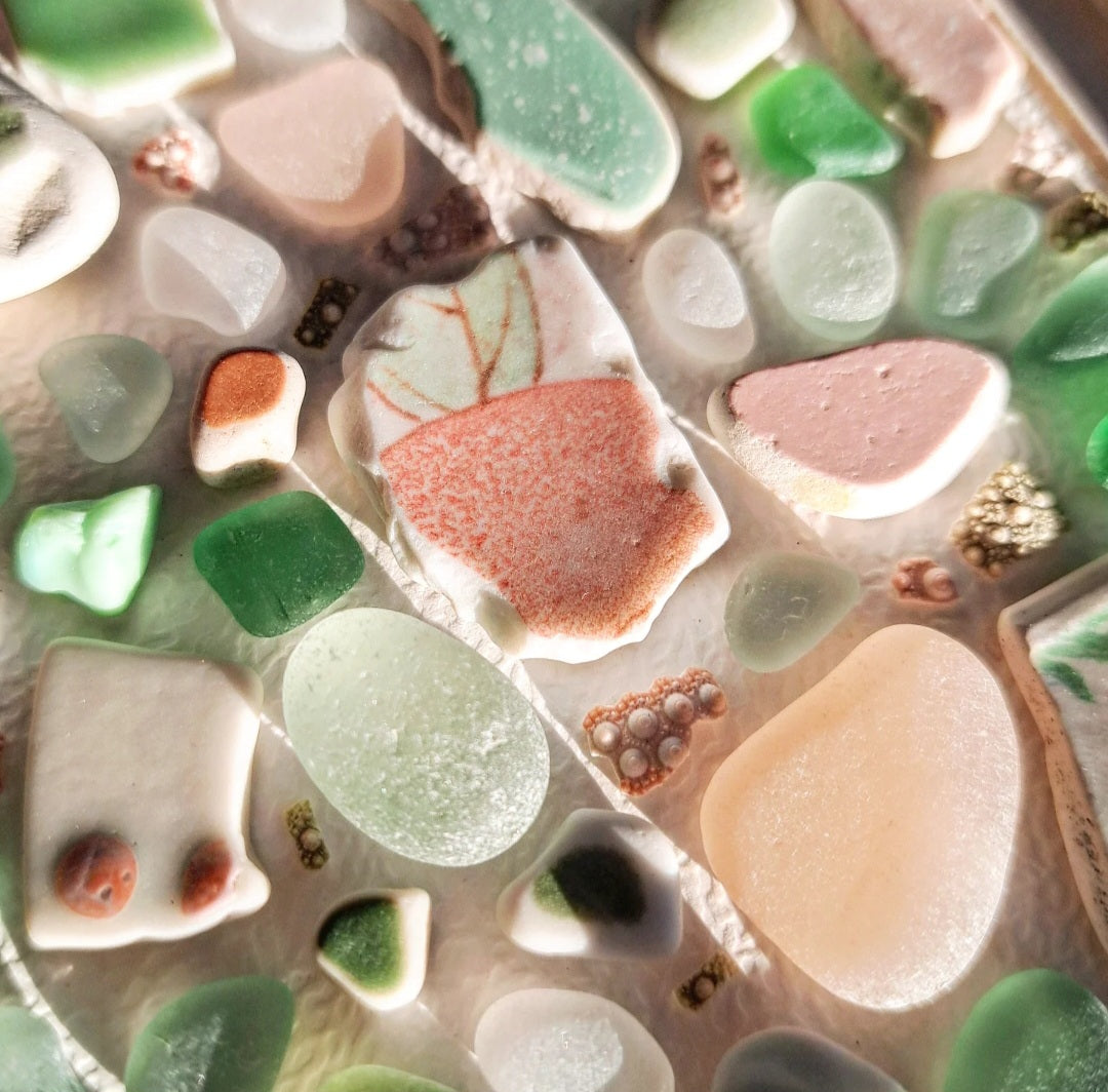 It's summertime here on Prince Edward Island, so my newest sea treasure frames include both fresh beach finds and special pieces from my long-time collection. I’ve been beachcombing for over 20 years, and sometimes I even find matching shards years apart. I also love going through my mom’s collection, which dates back even further.