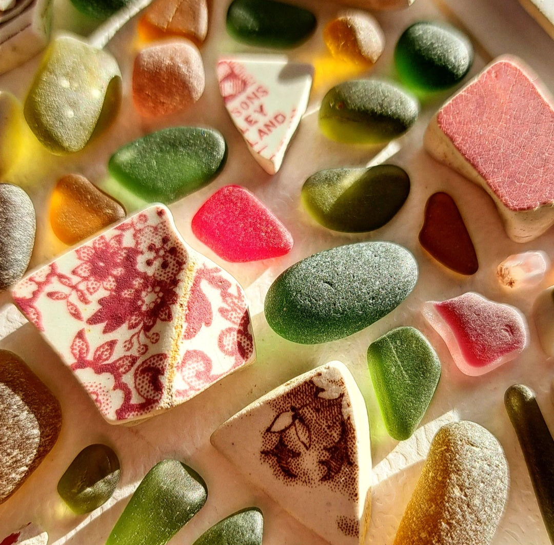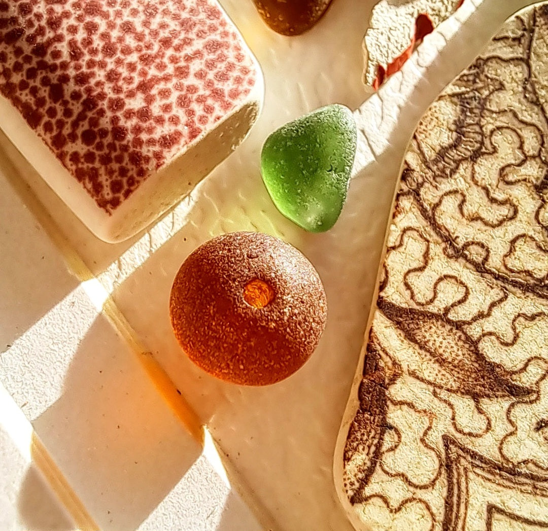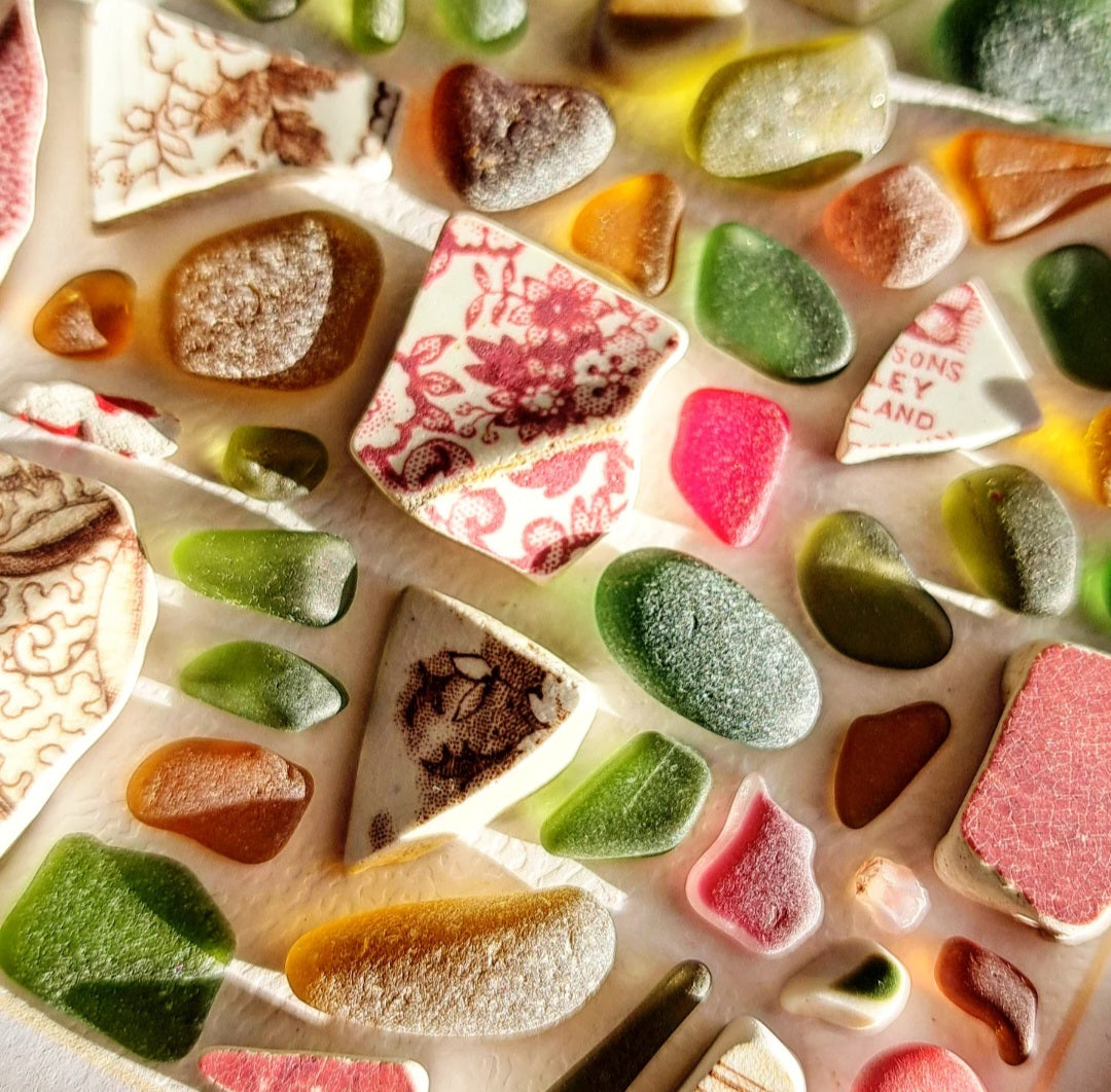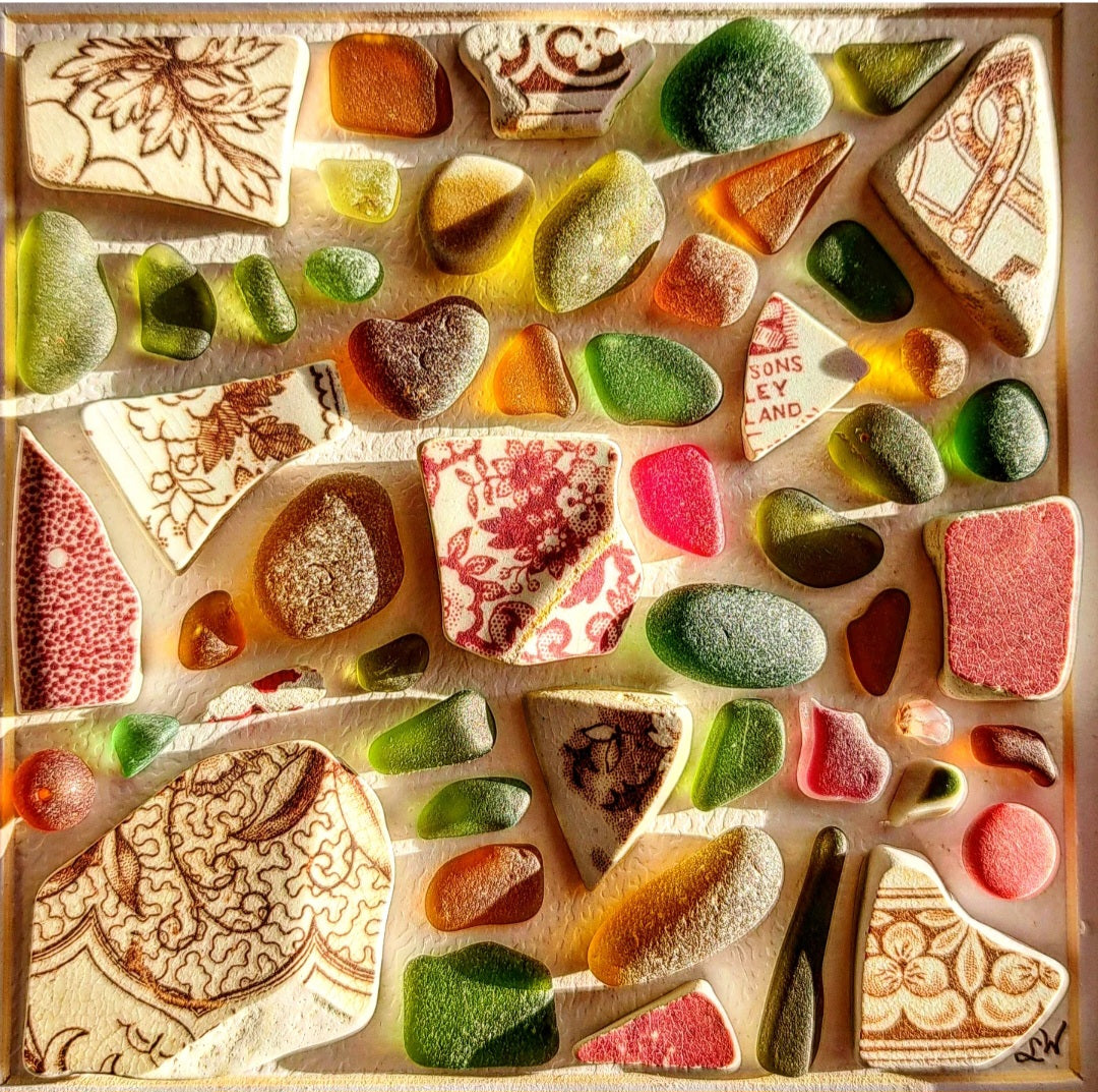 It's summertime here on Prince Edward Island, so my newest sea treasure frames include both fresh beach finds and special pieces from my long-time collection. I’ve been beachcombing for over 20 years, and sometimes I even find matching shards years apart. I also love going through my mom’s collection, which dates back even further.