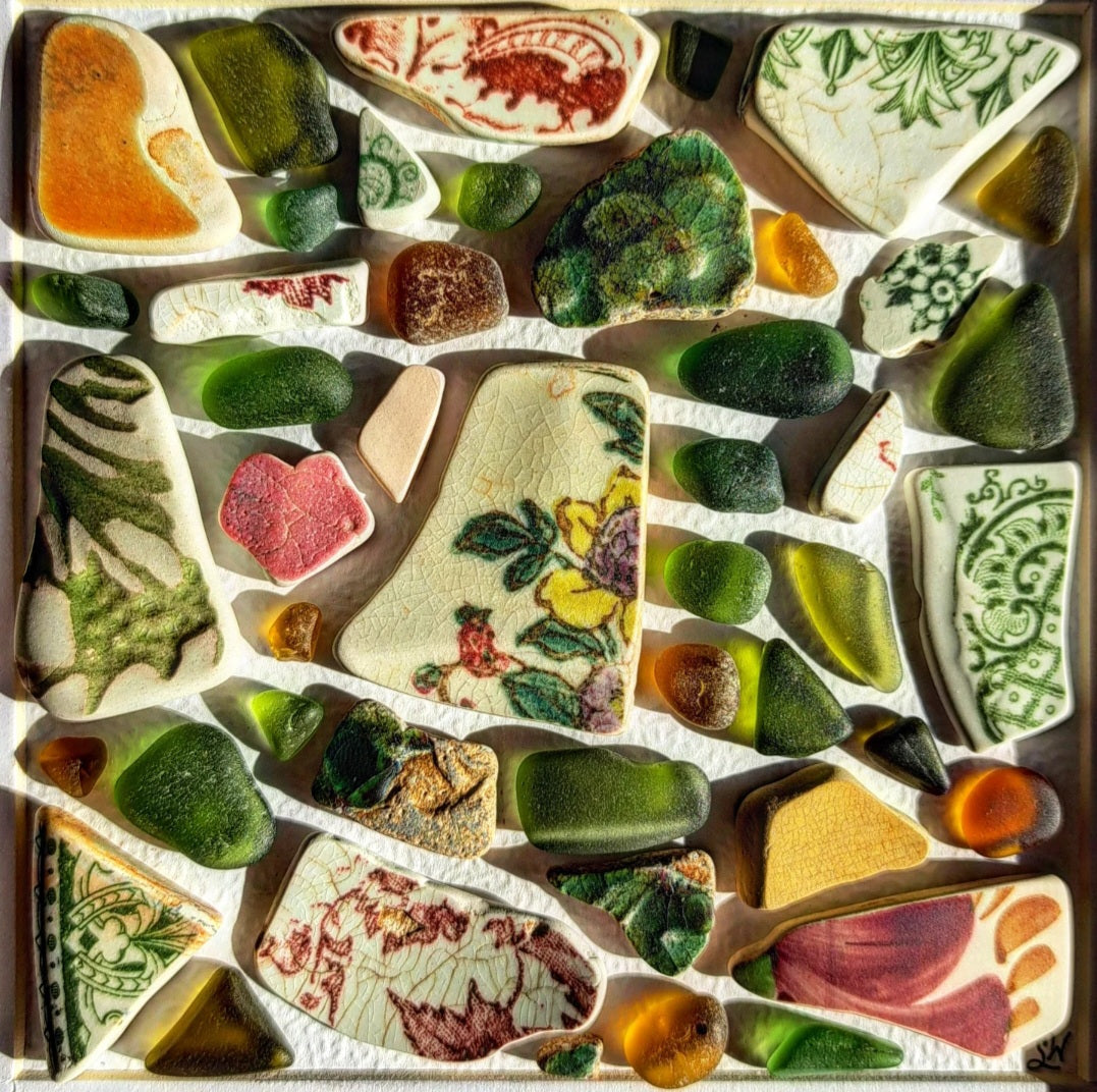 It's wintertime here in Prince Edward Island so my newly made sea treasure frames are filled with a combination of new and old finds. My beach-combing collection goes back more than 20 years and even longer for my Mom. I like to rummage through her collection and oftentimes I find shards from the same vessel found years apart.