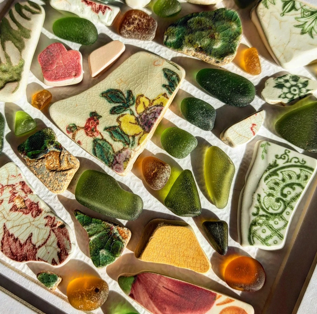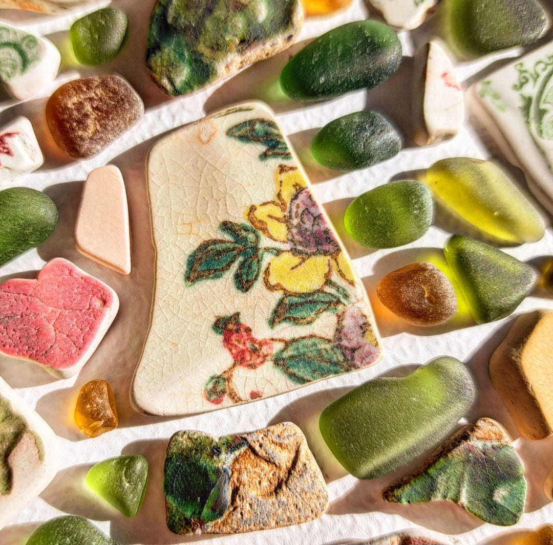Sea Glass Origins: Genuine sea glass and sea pottery originate from fragments of broken bottles, tableware, or even shipwrecks, which are gradually tumbled by the ocean over many years. This natural process can take between 50 to 100 years, during which the fragments are smoothed into their characteristic rounded shapes and the glass acquires a distinctive frosted appearance, resulting from the gradual erosion of its original sheen.