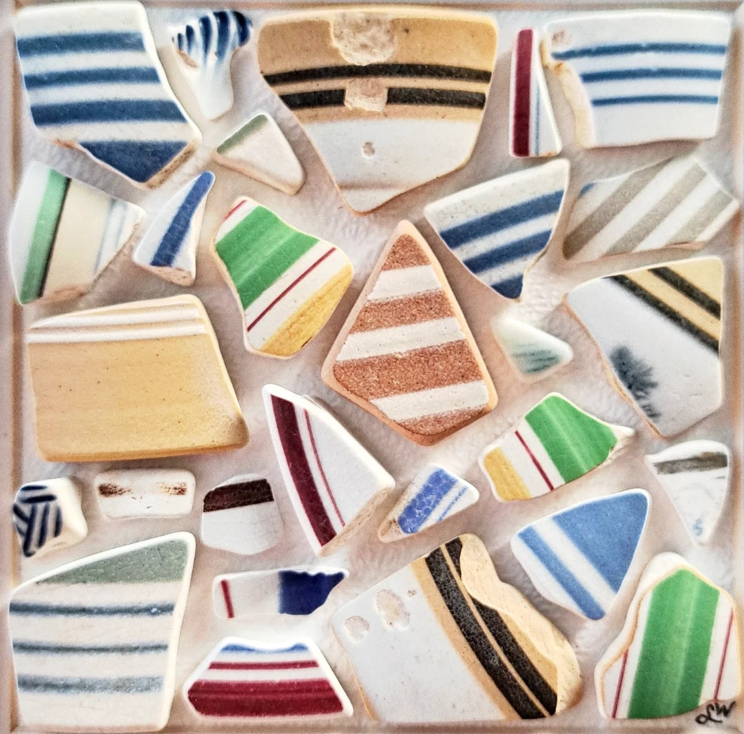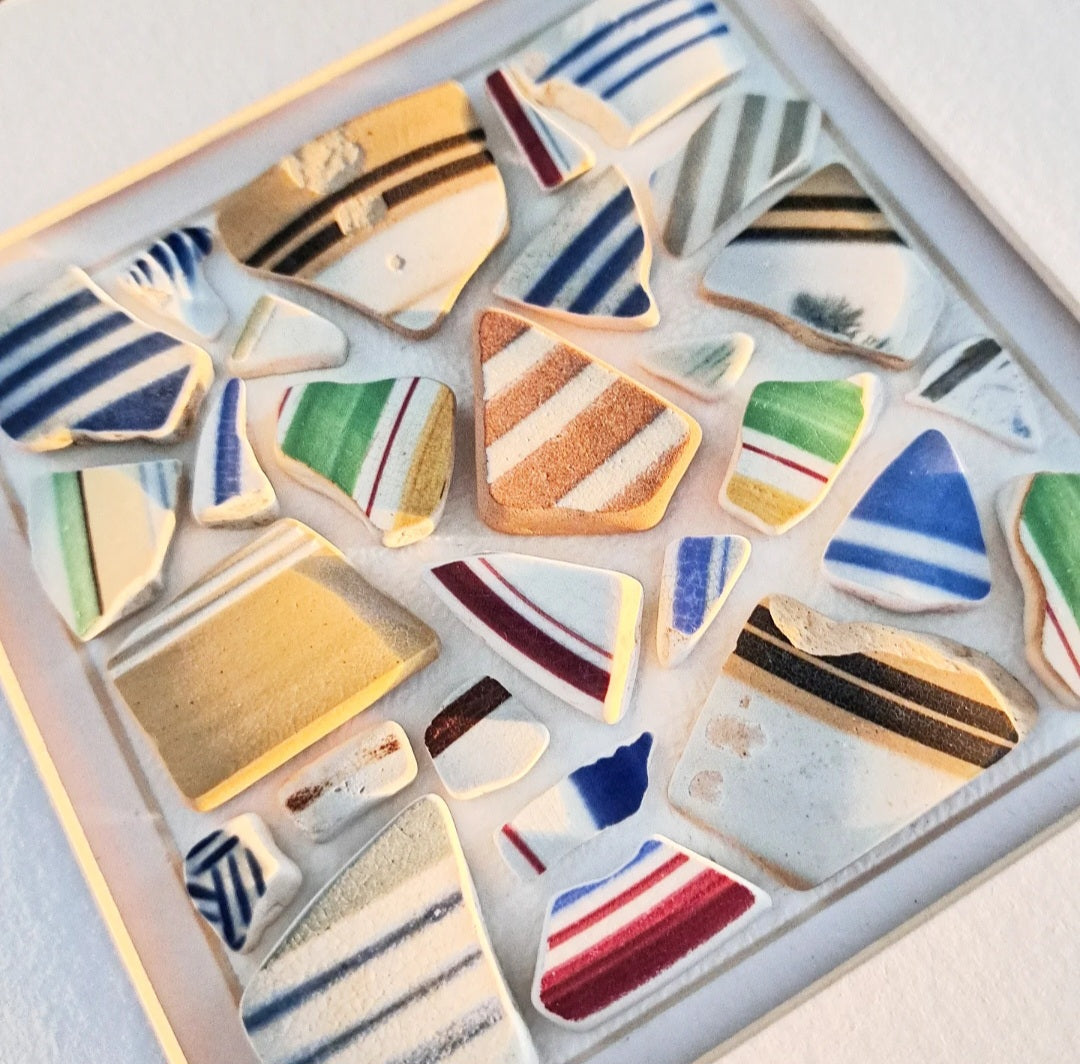 Collected patiently over the years, these fragments were once part of bowls, jugs, and mugs that served ordinary lives in extraordinary times. Tossed by the tides and softened by the sea, they now live again. Woven together in this striped collage that echoes the quiet beauty of the past.