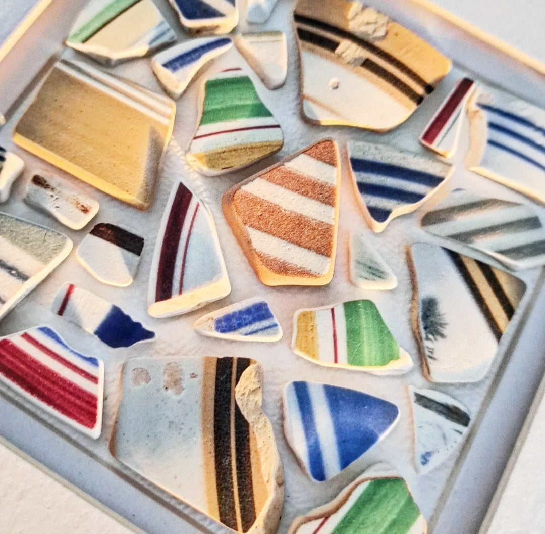 It's summertime here on Prince Edward Island, so my newest sea treasure frames include both fresh beach finds and special pieces from my long-time collection. I’ve been beachcombing for over 20 years, and sometimes I even find matching shards years apart. I also love going through my mom’s collection, which dates back even further.